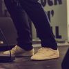 Meski mengenakan setelan jas, penampilan Arnold tampak segar berkat sepasang sneaker Adidas putih klasik yang dikenakannya.